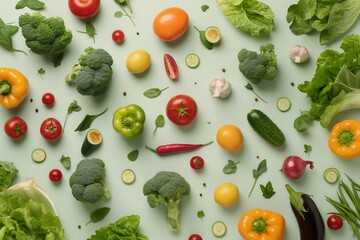 A flat-lay assortment of fresh vegetables spread out on a green surface, vibrant and healthy.