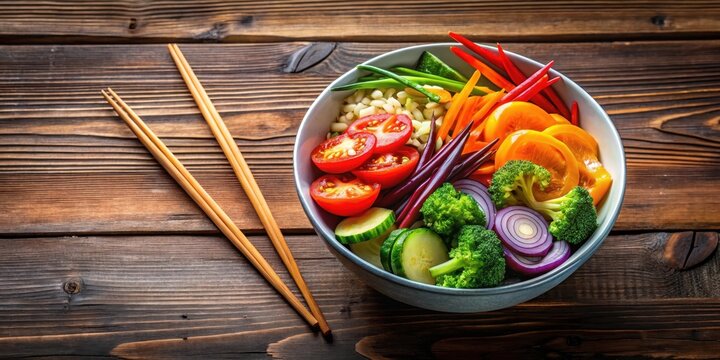 A bowl of colorful vegetables with chopsticks on a wooden table, healthy, vibrant, fresh, organic, nutrition, farm-fresh
