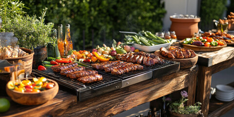 A rustic outdoor barbecue scene featuring grilled meats, vegetables, and vibrant condiments, creating a summer vibe