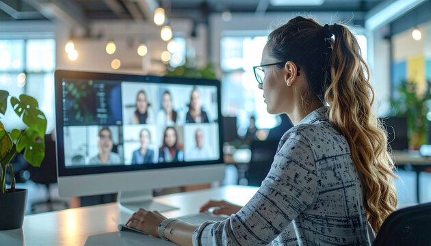 Connected Collaboration: A woman, focused and engaged, participates in a vibrant video conference, fostering connection and collaboration amidst a dynamic workspace.
