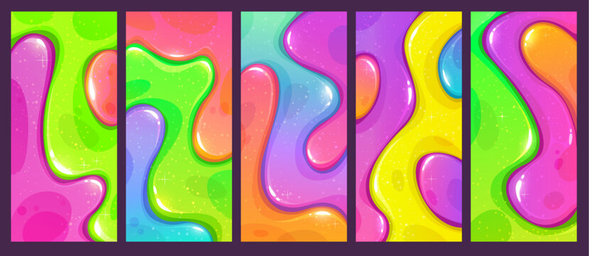 Colorful abstract slimy wave background. Glitter mixed slime texture.Bright abstract gel texture with vibrant colors and glossy liquid shapes. Colorful jelly long vertical backgrounds set.
