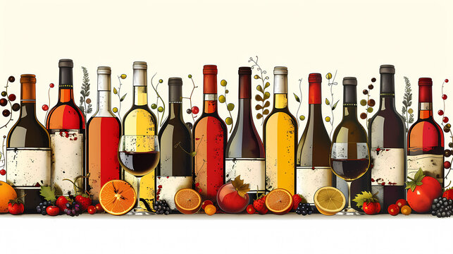 Autumnal Wine Tasting: Red wine bottles and a glass, surrounded by grapes and autumn leaves in a vibrant, stylized illustration. Perfect for wine labels, menus, or fall-themed designs.