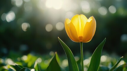 A vibrant yellow tulip, its petals unfurling like a miniature sun, stood majestically against a backdrop of verdant green foliage.