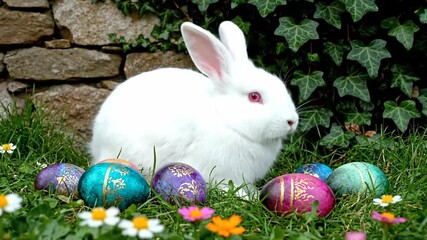 A fluffy white rabbit with pink eyes sits alert in lush green grass surrounded by vibrantly colored and intricately decorated Easter eggs with a stone wall and ivy covered background casting soft