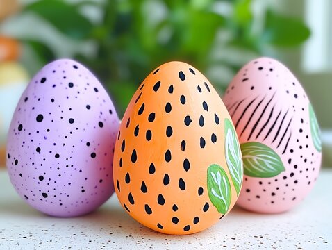 closeup photo of a collection of vibrantly painted Easter eggs with a variety of bold geometric and playful hand-painted patterns, including polka dots, stripes, plaid