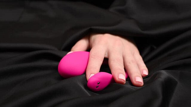 Woman taking a pink vibrator lying on a black silk sheet.