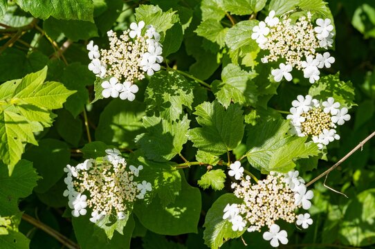 Blooming viburnum opulus (guelder rose buldenezh). Decorative viburnum bush with white flowers on branches in the shape of snowballs in the garden next house