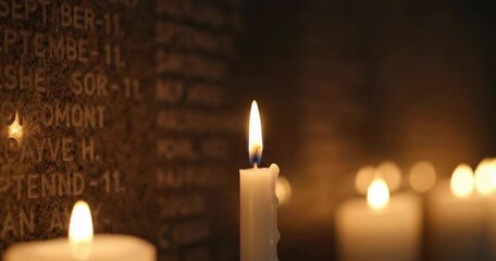A moving close-up shot of a hand lighting a candle with a match, illuminating a dark memorial wall engraved with names of victims from the September 11 attacks in a solemn vigil.