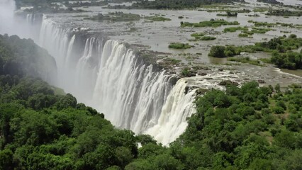 Aerial view Victoria Falls. Beautiful nature of Africa with a waterfall on the Zambezi River with tons of water falling into the gorge.