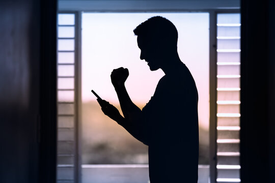 Young man on his smartphone looking at tablet screen clenching his fit felling victorious accomplishing his goals.