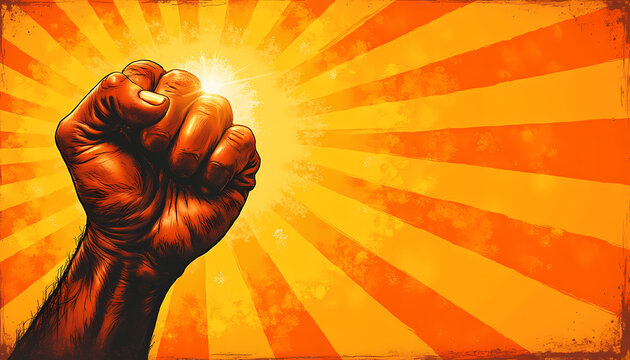 A graphic art representation of a victorious athlete crossing the finish line, arms raised, in bold yellow and black contrast