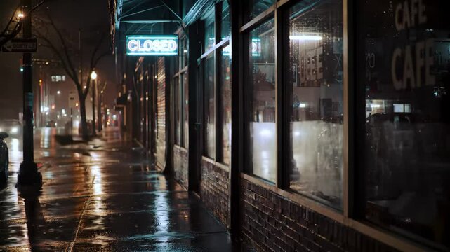 A wet city street at night during rainfall, focusing on a closed cafe storefront with a glowing blue neon "Closed" sign. Cars pass by, reflecting lights on the sidewalk. Great for depicting late-night