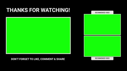 Animation End screen YouTube channel with three templates for video on a black background. Thanks for watching and reminder for likes, comments and share. Green screen chroma key. Alpha channel.