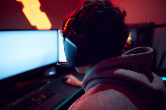 Group of cheerful excited children or professional gamers playing video games on computer in game room.