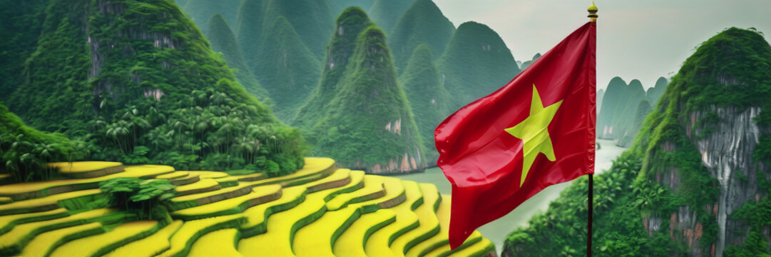 Vietnam's Independence Day. a holiday in Vietnam.the Vietnamese flag. the Vietnamese flag on the background of Vietnamese nature. Vietnamese nature