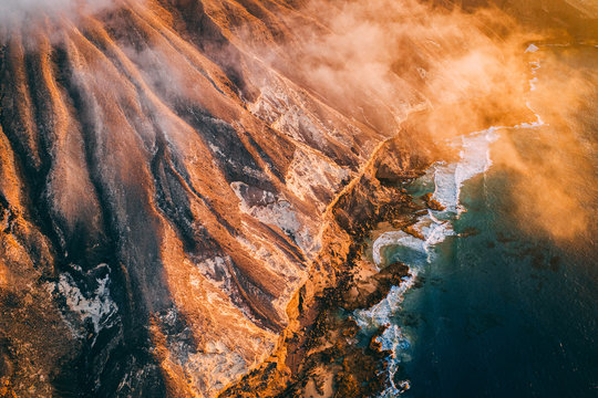 Spectacular hurricane photo, top view of seascape ocean wave crashing rocky cliff with sunset at the horizon as background.