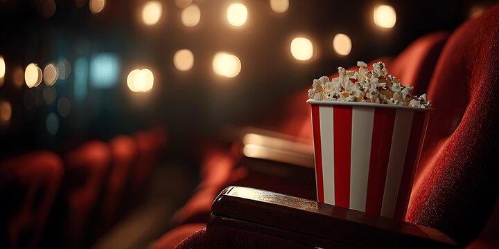 An empty row of red theater seats illuminated by soft lighting, creating a sense of anticipation for the upcoming movie