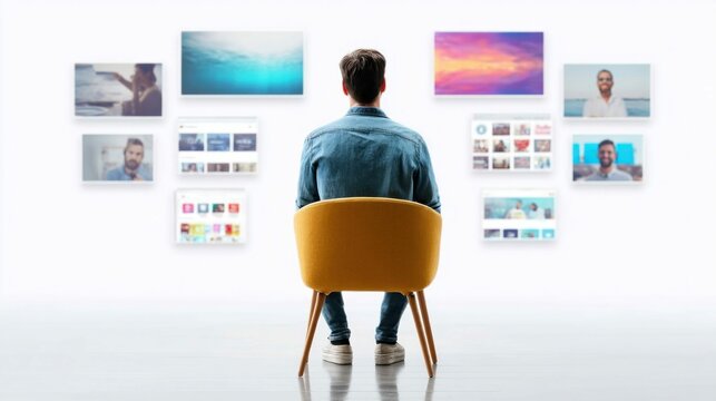 A man seated, observing multiple screens that are suspended in the air against a white wall.