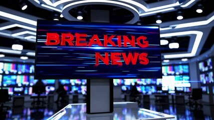 A breaking news update is presented in a modern news studio filled with digital displays. Bright graphics and rapid transitions create a dynamic atmosphere for current events coverage.