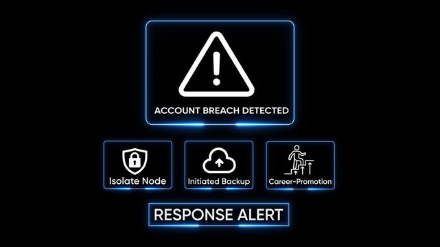 Digital alert system cybersecurity threat detection account breach warning isolate node initiated backup career promotion data protection network security concept futuristic interface glowing