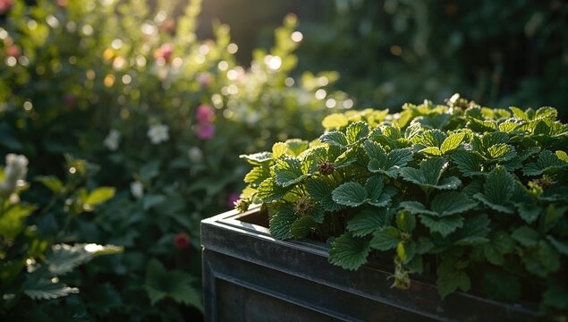 Healthy strawberry seedlings in a planter highlighting vigorous foliage for gardening use