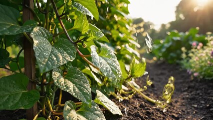 Close-up view of a lush garden bed with broad green leaves and vigorous vines bathed in bright sunlight.