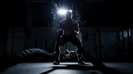 Shirtless man exercising with battle ropes in a dark gym under bright light