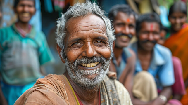 Group of old and young Indian villager men in a village in India. Happy and smilling.