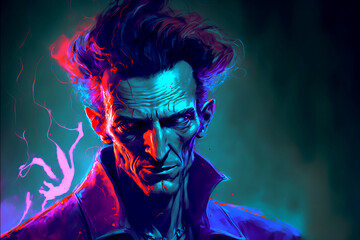 Portrait of a crazy villain with red eyes on a futuristic background. The face of an angry man is furious.