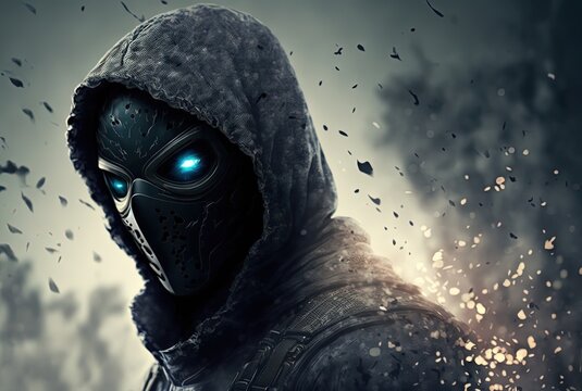 Computer hacker in black mask and hoodie. Obscured dark face. Data thief, internet fraud, cyber security concept.