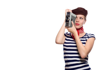 beautiful girl with red bandana, beret and striped shirt in a classic 60s french look holding a vintage 8mm substandard camera