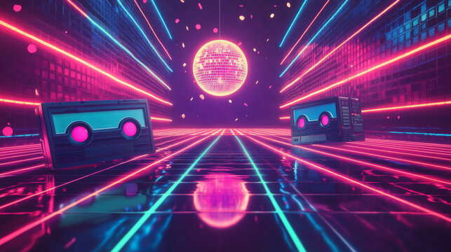 Retro mixtapes cartoon poster with audio cassettes, disco ball and dance floor. Mix tapes store ad, vintage style analog devices for music and sound play, culture of eighties ages, vector illustration