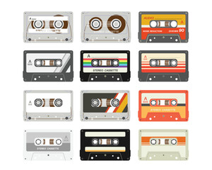 Retro cassette tapes collection, flat vector illustration of vintage audio music