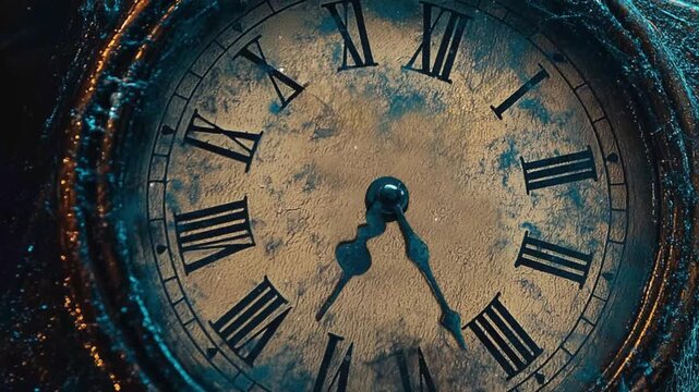 A 4K video of a spinning Old creepy rustic hand held clock coated in cob webs, halloween, spooky, ghosts, eerie, haunted