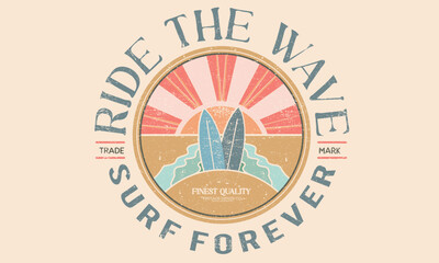 Surfing board and big wave vintage graphic print design for t shirt and others. Beach adventure, background. Summer vibes illustration. Feel the sunset.