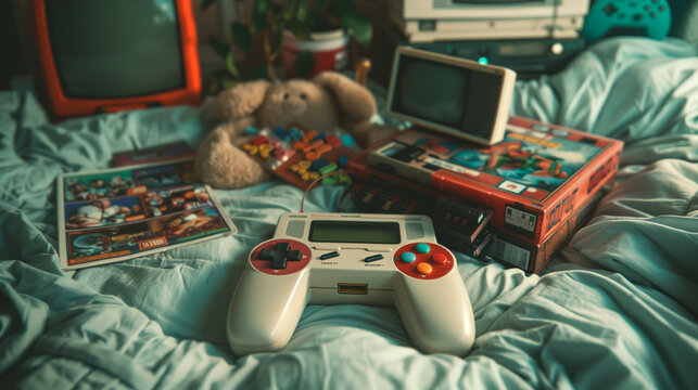 Colorful collection of vintage and modern game controllers. Generative AI image