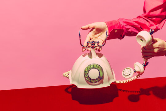 Unidentified man holding red wired retro telephone handset on light blue banner background. Male hand holds handset of landline phone aimed at free space for text. Customer support concept.