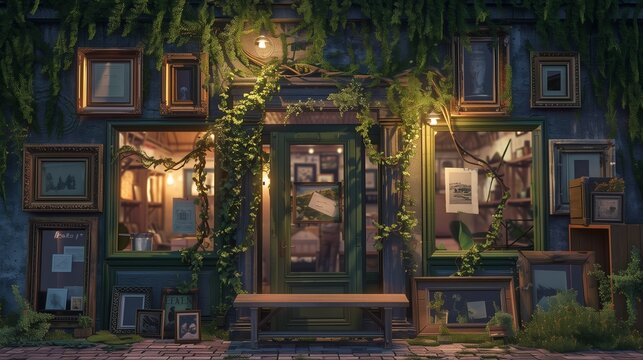 A cozy vintage boutique draped in trailing vines. The fa? section ade is adorned with mismatched antique frames and a quaint wooden bench invites shoppers to linger. Soft music plays inside.