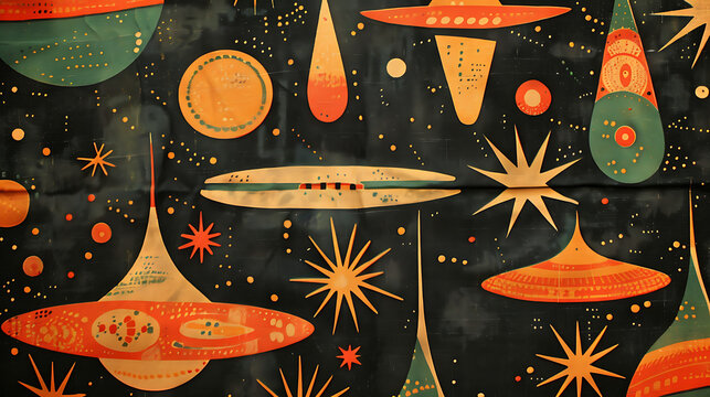 Handmade framed tapestry with landscapes hanging on wall with vintage wallpaper