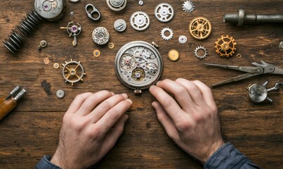 Watchmaker carefully disassembling a vintage watch on a wooden workbench with intricate components.