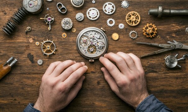 Master watchmaker's hands meticulously repairing an intricate antique clock mechanism, highlighting skilled craftsmanship and precision work under ...