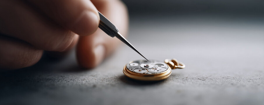 Watchmaker carefully using tweezers to adjust and repair the intricate mechanism of a luxurious golden watch, showcasing exceptional precision and expertise in the art of horology