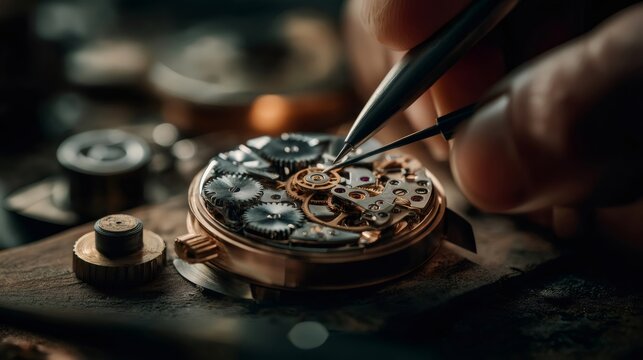 Watchmaker repair precision tool hand focus mechanical gear closeup craftsmanship, repairs mechanical watch with intense focus and precision tools