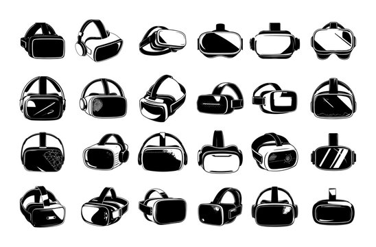 Vr garniture ink sketch vector set. Virtual reality glasses digital gadgets devices augmented universe icons isolated on white background