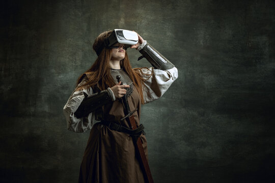 Portrait of young wman, medieval warrior, knight with long hair in VR headset isolated over dark vintage background. Comparison of eras, history