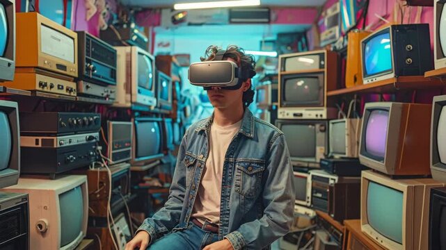 Young man wearing a modern VR headset surrounded by stacks of retro vintage televisions.