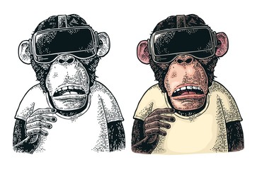 Monkey wearing virtual reality headset and t-shirt. Vintage color engraving