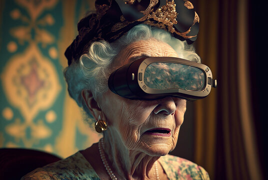 Futuristic woman with vr headset in retro setting: Stylish woman models a virtual reality headset, blending modern technology with vintage aesthetics