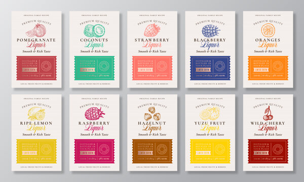 Family Recipe Fruit, Berries and Nuts Liquor Acohol Labels Collection. Abstract Vector Packaging Design Layouts Set. Modern Typography Banners with Hand Drawn Logo and Background.
