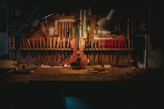 Luthier workshop where violins are building with different tools to work on wood